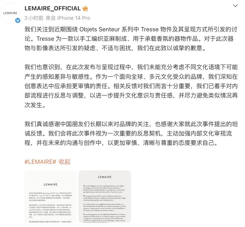 4月26日,@LEMAIRE_OFFICIAL 发文致歉: