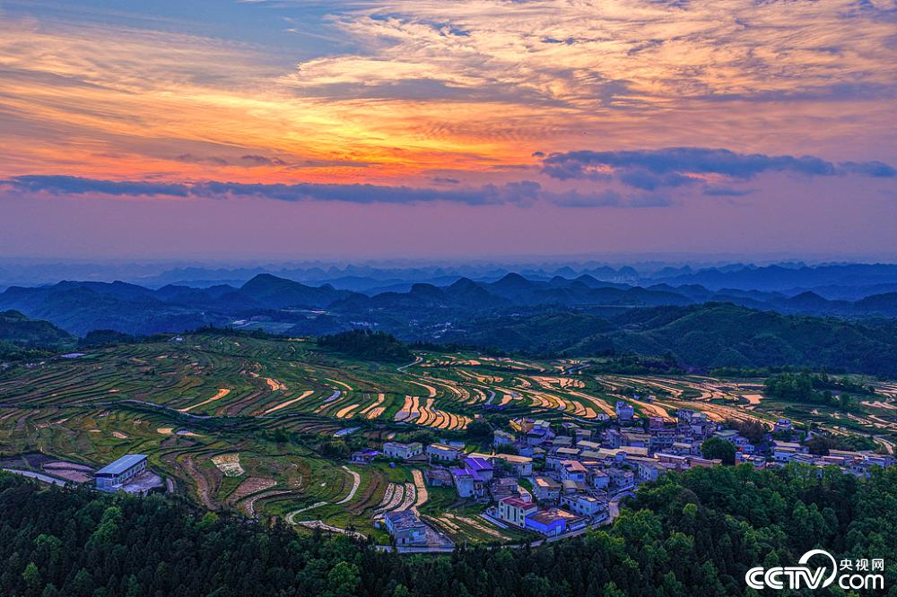 4月25日,贵州龙里,晚霞映照下的梯田风光。