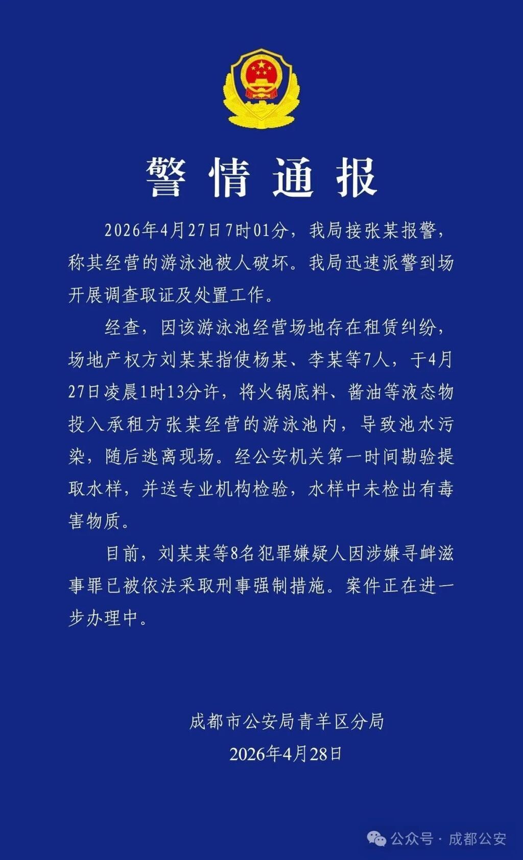 4月28日,成都市公安局青羊区分局发布警情通报。