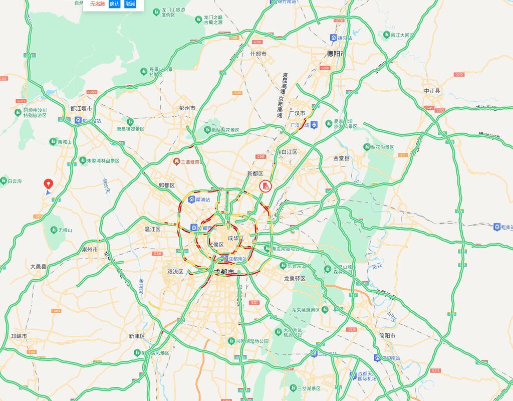 成都第二绕城高速(SA2)、成都第三绕城高速(SA3成都都市圈环线高速):与成都周边各主线省管高速的互通枢纽(如青白江、都江堰、崇州、新津、简阳、金堂等枢纽)车流交汇密集,受主线车流溢出影响,普遍出现缓慢排行。