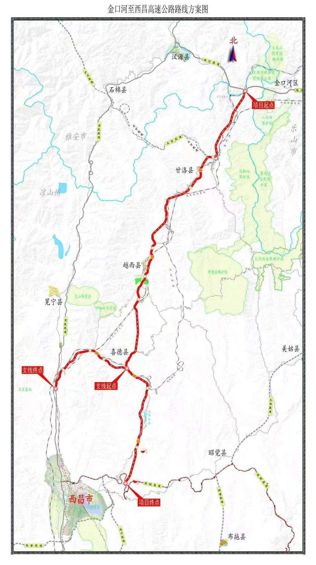 金西高速公路项目属国家“十四五”规划重大工程,由蜀道集团投资建设,项目全长约211.2公里,分主线和泸沽支线建设。其中,主线起于凉山州甘洛县,经越西县、喜德县,止于西昌市,长度约173公里;泸沽支线止于冕宁县,长度约38公里。全线采用双向四车道高速公路标准建设,设计时速80公里,桥隧比高达75.55%,总投资496.52亿元,预计建设工期6年。建成后,将结束凉山州甘洛、越西、喜德三县不通高速的历史。