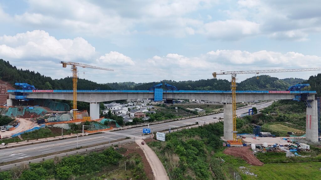 蒋家沟特大桥是绵遂资内铁路绵遂段重难点工程,全长560.55米,桥梁的主跨“骑”在遂宁至大英快速通道之上,一边是建设中的铁路线,一边是繁忙的交通通道,施工如何既保证质量又最大限度减少对交通的影响,成为项目建设的关键难题。