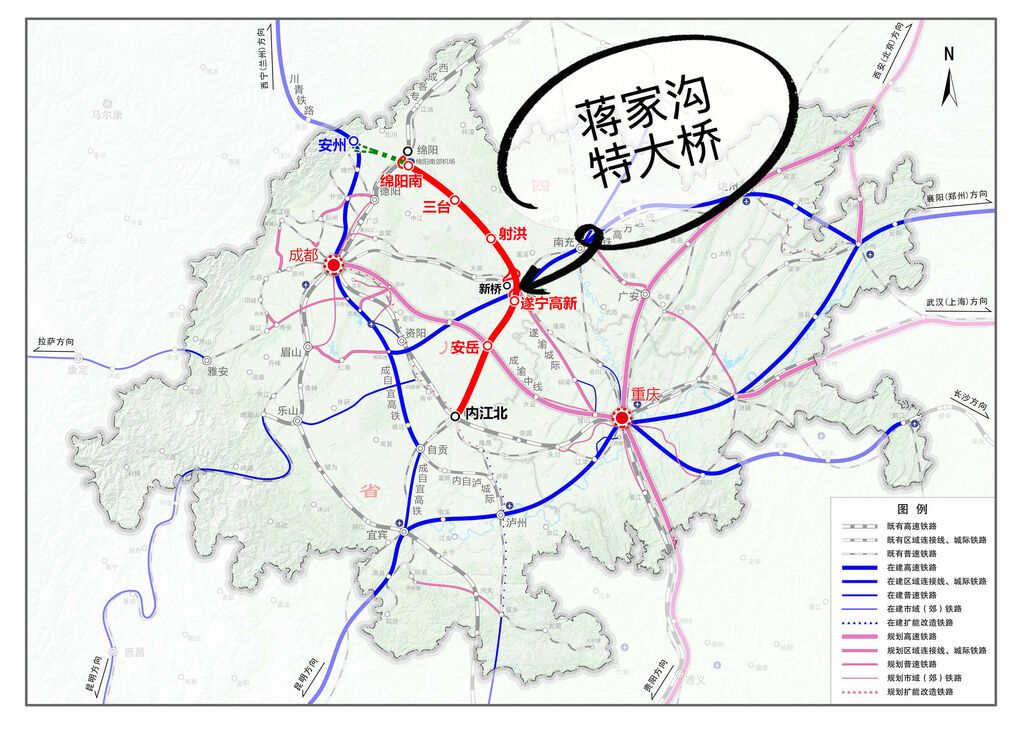 绵遂资内铁路线路以绵阳站为起点,终至内江北站,贯穿绵阳、德阳、遂宁、资阳、内江5市共11个县级行政区,正线全长244公里,设计时速250公里。其中,绵阳至遂宁段计划于2028年建成通车,截至2026年4月底,已完成投资135.78亿元。项目建成通车后,将结束三台县、射洪市不通铁路的历史。